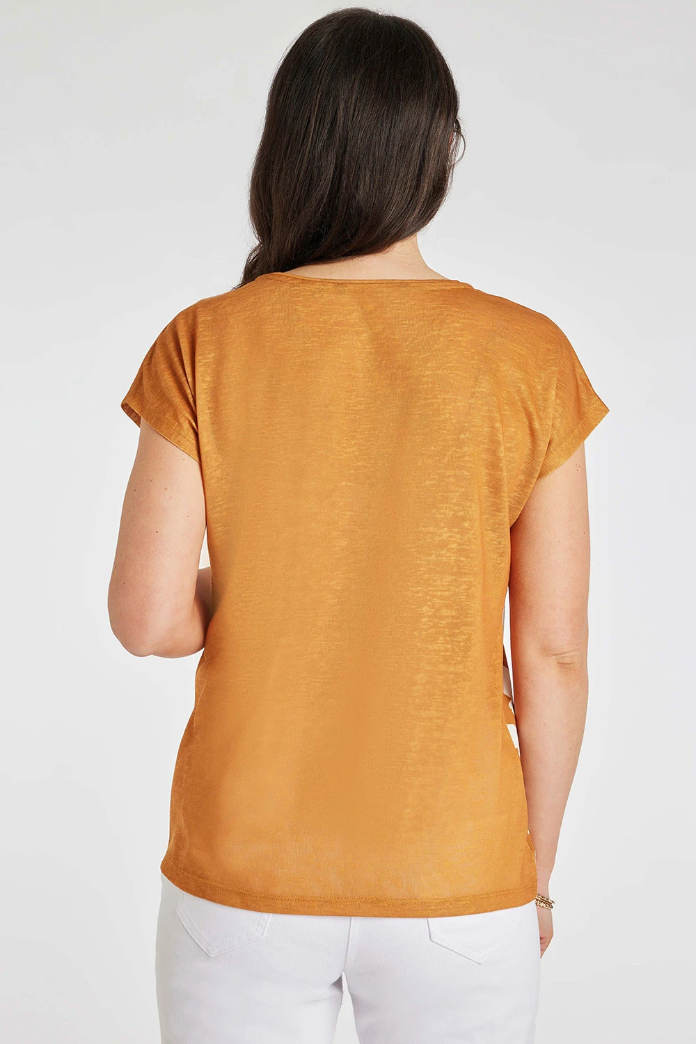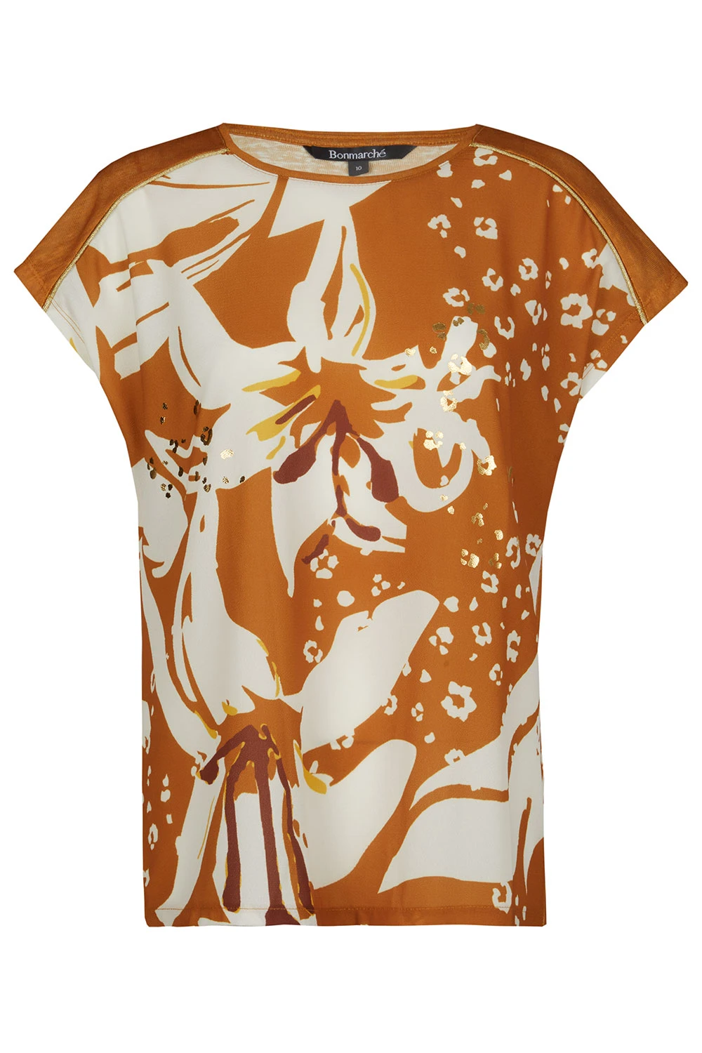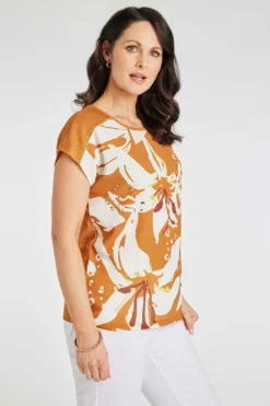 Stand out this Summer with this beautifully designed large floral print top. The white and orange contrasting flowers paired with the foil detailing give the top a holiday feel. Pair with linen trousers and sandals for a great weekend look.