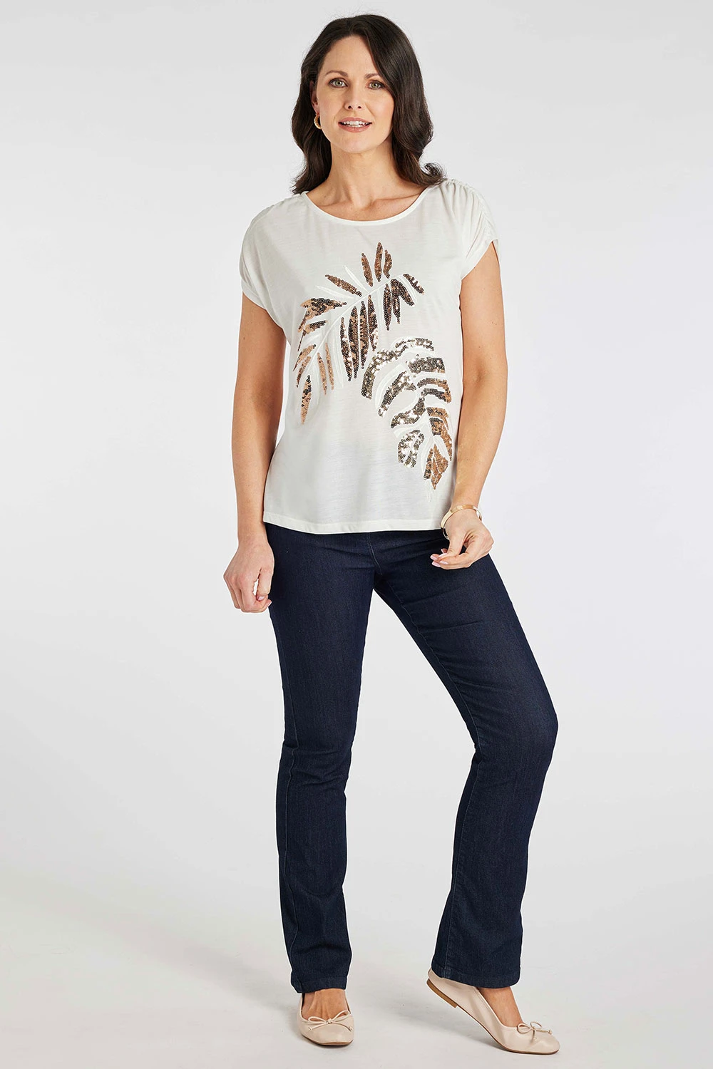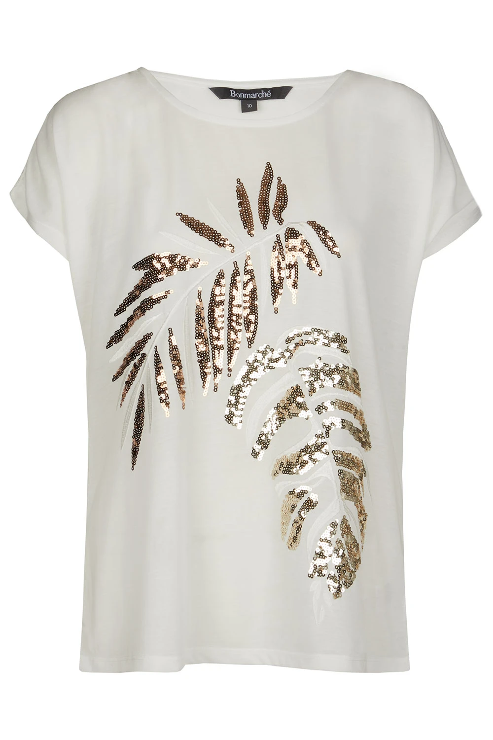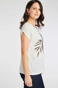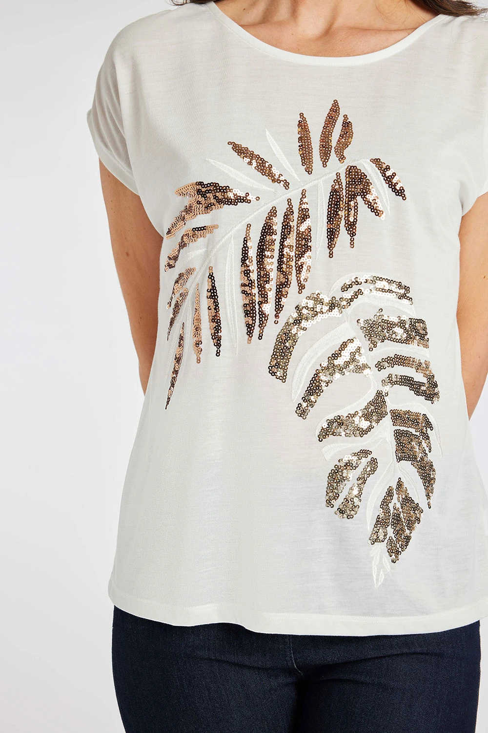 Add some sparkle to your Summer wardrobe with this beautifully designed sequin leaf top. Complete with a round neckline and short sleeves makes this top comfortable and fashionable for the warmer weather. Wear with linen trousers and sandals for a great holiday look.