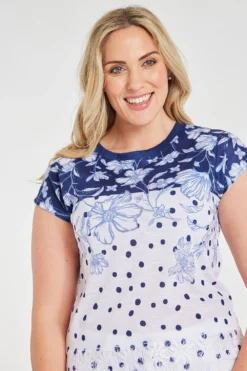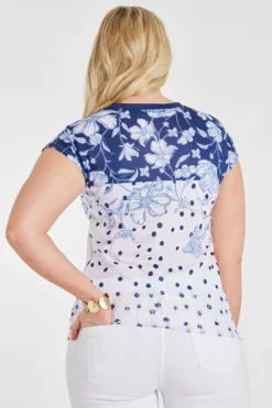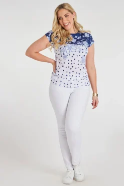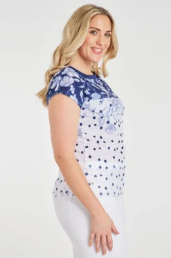 Add this two-tone spots and floral print top to your collection this Spring. The blue and white colour gives it a delicate and feminine loo. Paired with the spots and flower design makes it a stand-out piece. Style with jeans and knee-high boots for a smart casual look.