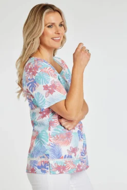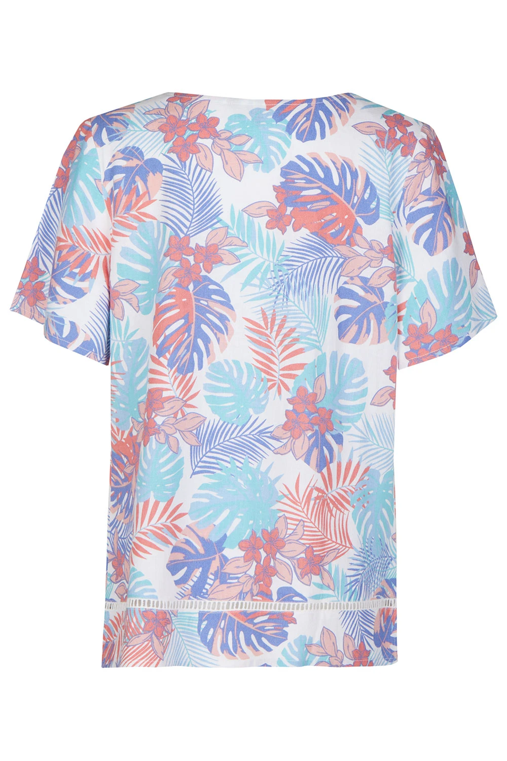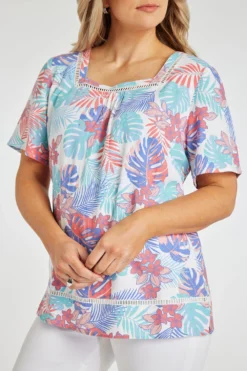 This tropical leaf print top is a great twist on a classic style. Complete with short sleeves and a square neckline to keep you comfortable and stylish this Summer. Wear with jeans and boots for the perfect casual look.