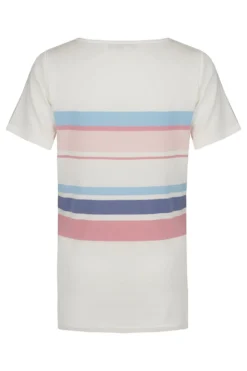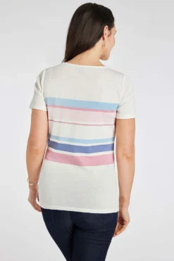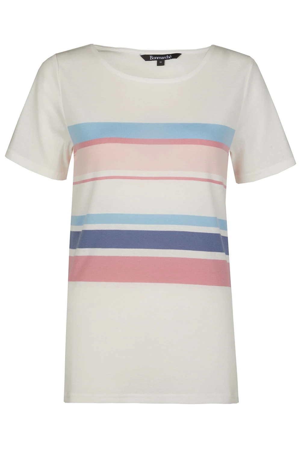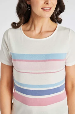 A wardrobe must have, this easy to wear striped t-shirt with pretty colour scheme that is perfect for layering or on a hot day with shorts. Wear with one of our gilets for the perfect casual look in colder weather.
