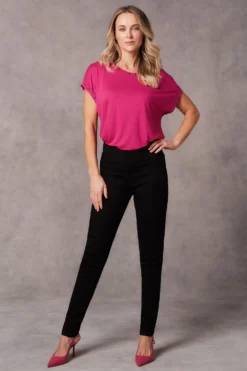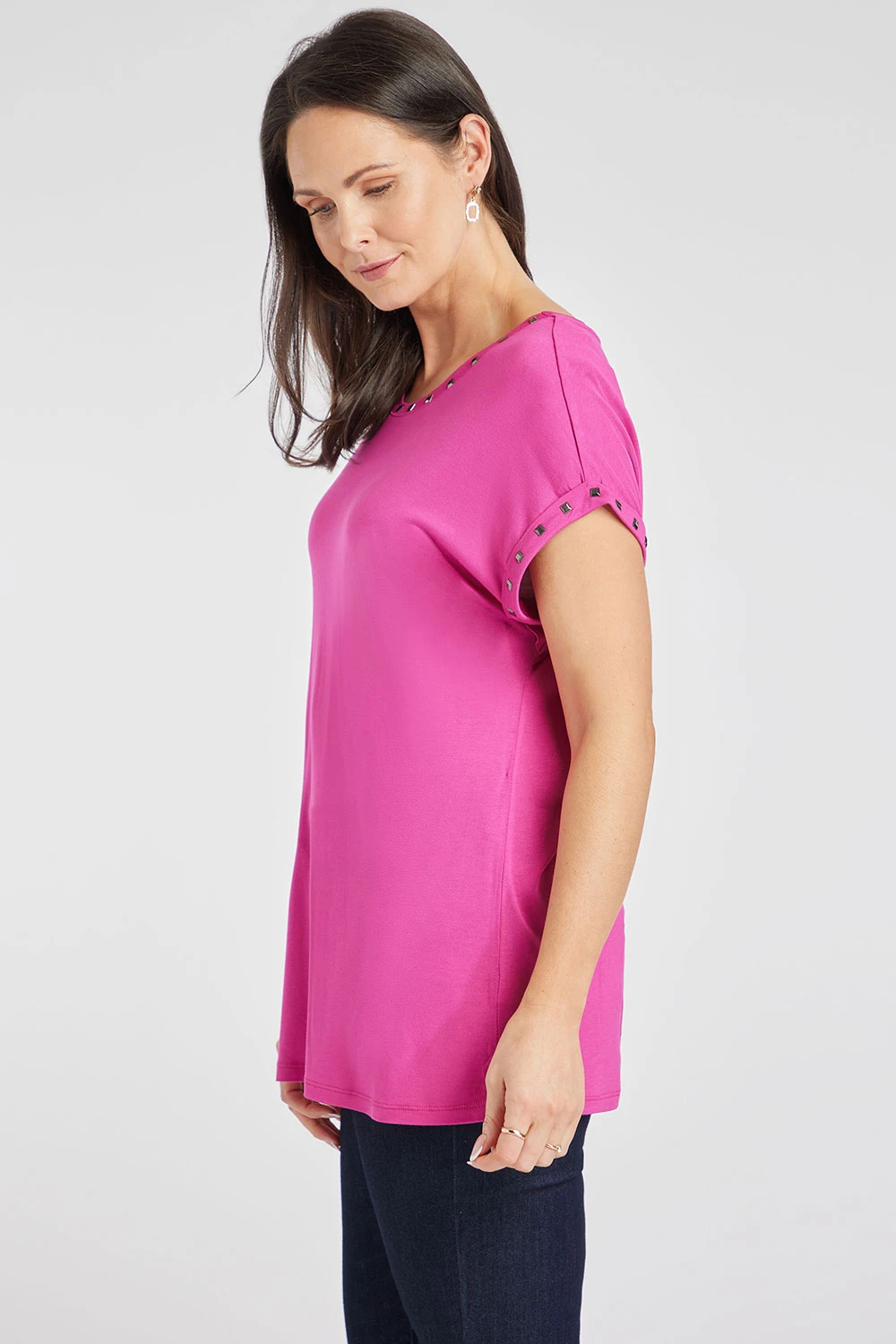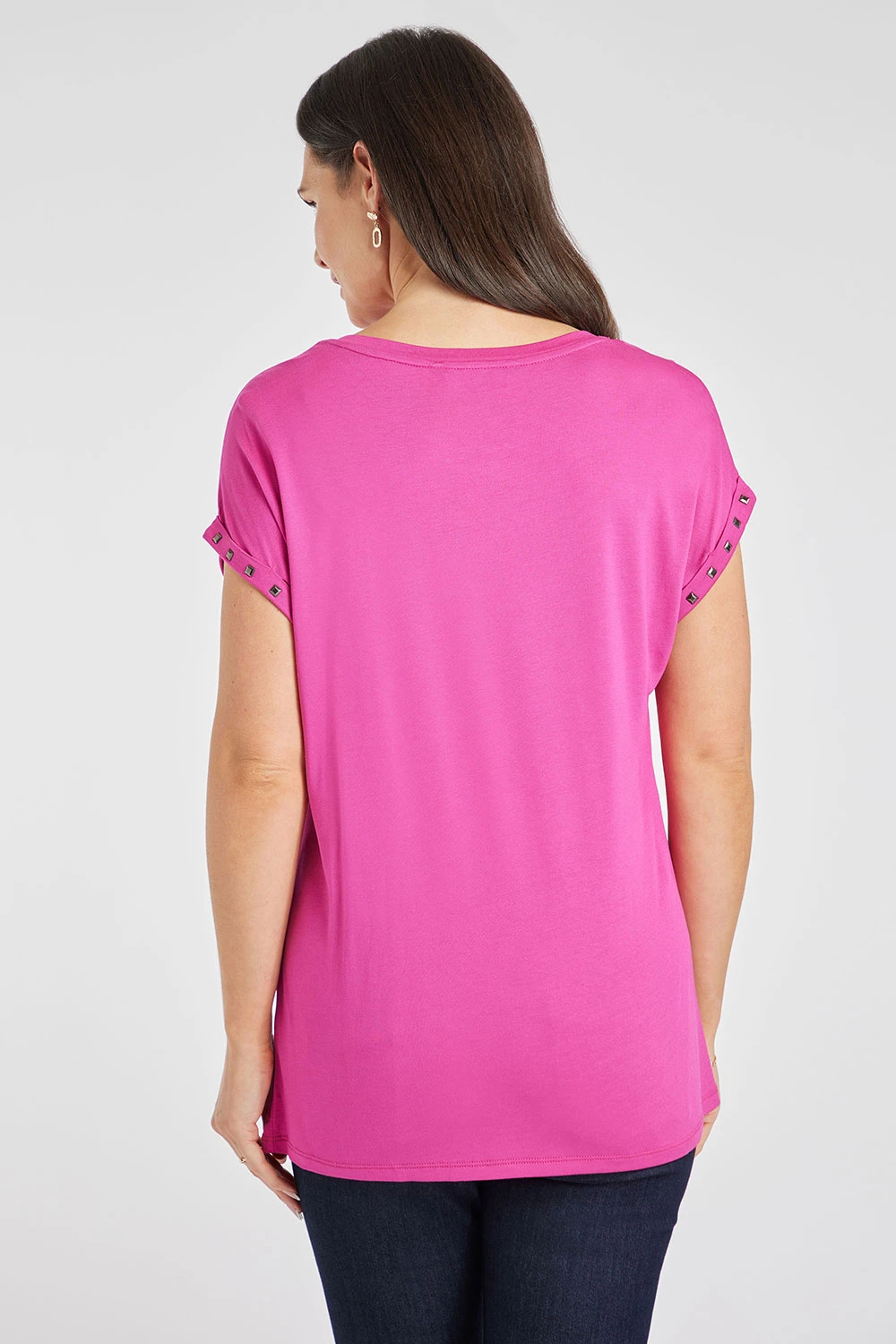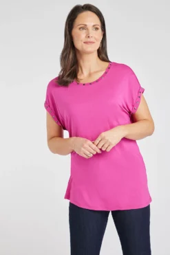 Add this plain top with stud detail to your collection this season. The plain design is great for easy styling and the stud detail adds a shine to the outfit. The round neckline and short sleeves keep it comfortable and breathable as it gets warmer. Being a part of Lorraine Kelly’s collection makes this a must have.