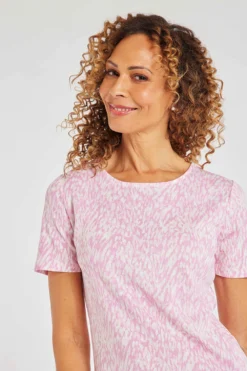 Add this subtle animal print tee to your wardrobe this season. The animal print adds a fun touch to a classic top. The short sleeves and scoop neck make it comfortable and breathable for when it gets warmer. Pair with jeans and trainers for a great casual look.