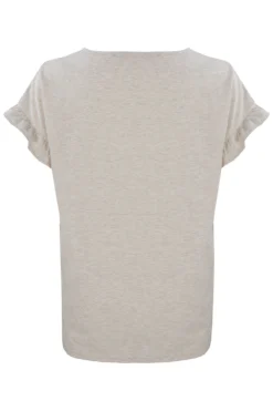 This short sleeve, round neck t-shirt features a trailing floral print around the neckline and frill detail. The perfect t-shirt to wear on holiday with shorts or cropped trousers to complete the look.