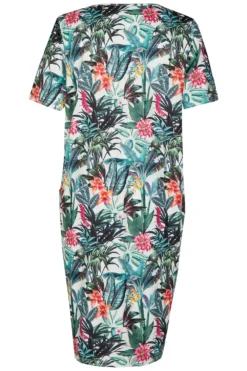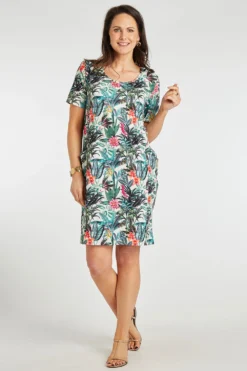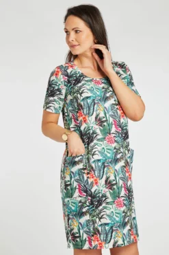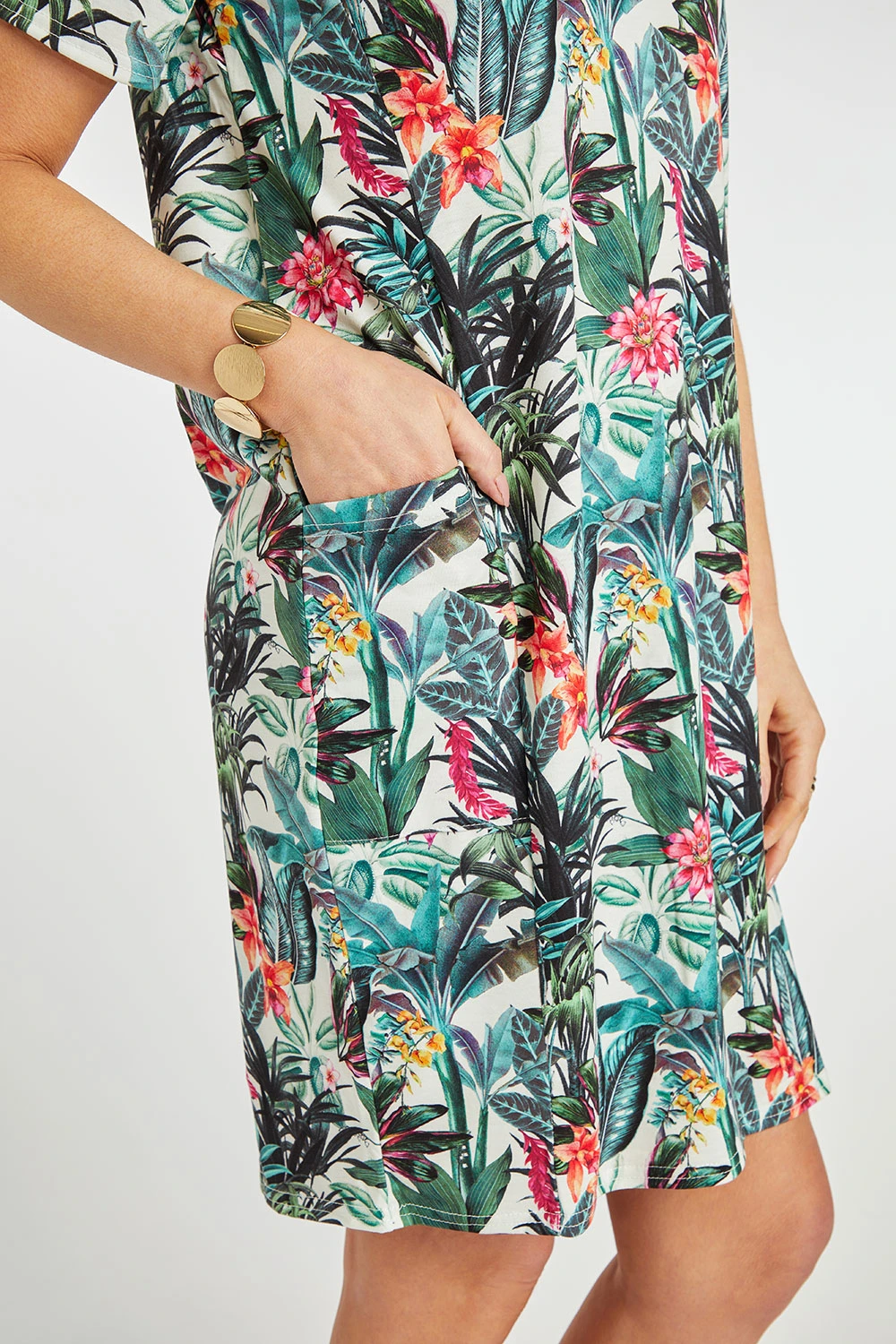 Add this short sleeve, printed dress to your collection this Summer. The beautifully designed tropical print against the green background paired with the breathable and comfortable fabric makes it a must-have this season. Pair with heeled boots and a light jacket for a great going out look.