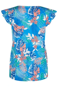 Add this sleeveless tropical print vest to your collection this Summer. The blue and orange colour scheme paired with the frill detail on the sleeves adds a feminine touch to a classic style. Wear it with linen trousers and sandals for a great holiday look.