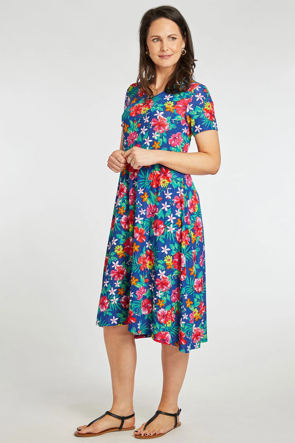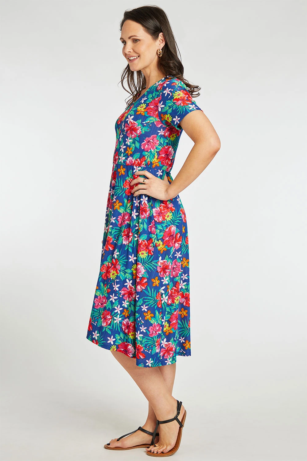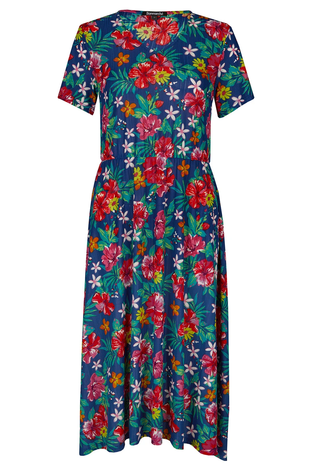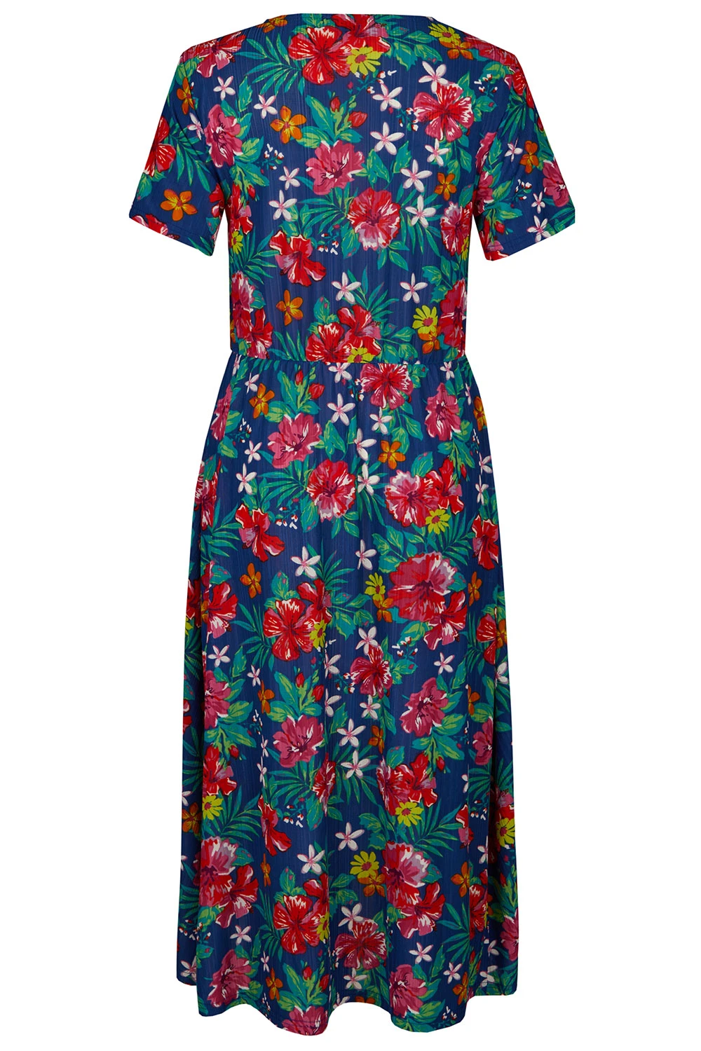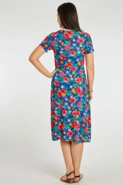 Stand out this season with this beautifully designed tropical flower print dress. Complete with short sleeves and a v-neckline to keep you comfortable and fashionable this Summer. Pair with strappy sandals and a light jacket for the perfect Spring evening look.